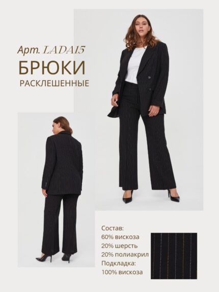 Брюки выполнены из эластичной, средней плотности костюмной ткани. Дышащий материал, малосминаемая ткань.