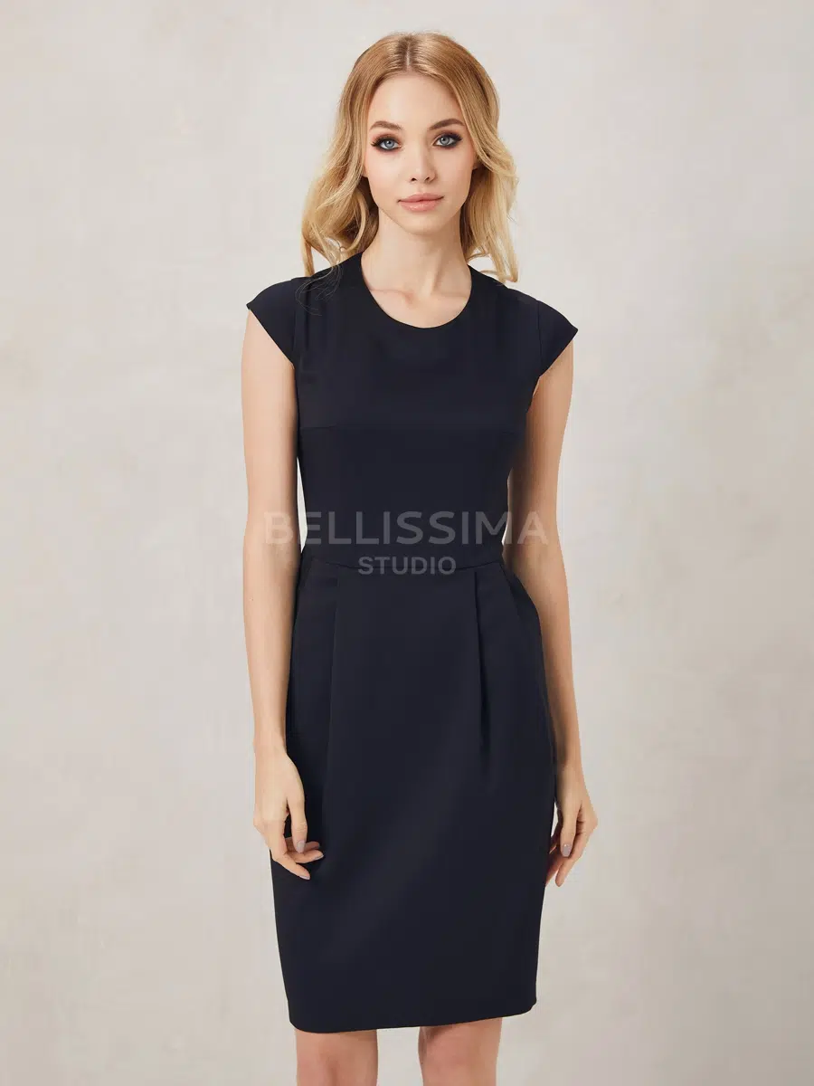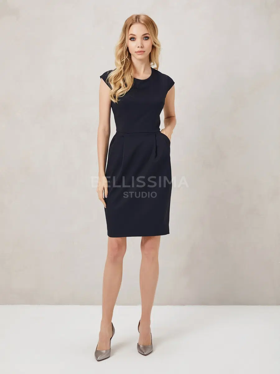 Элегантное платье из полушерстяной ткани. Приталенное.- застежка на молнию;- юбка с разрезом сзади, силуэт зауженный;- рукава короткие;- без подкладки.