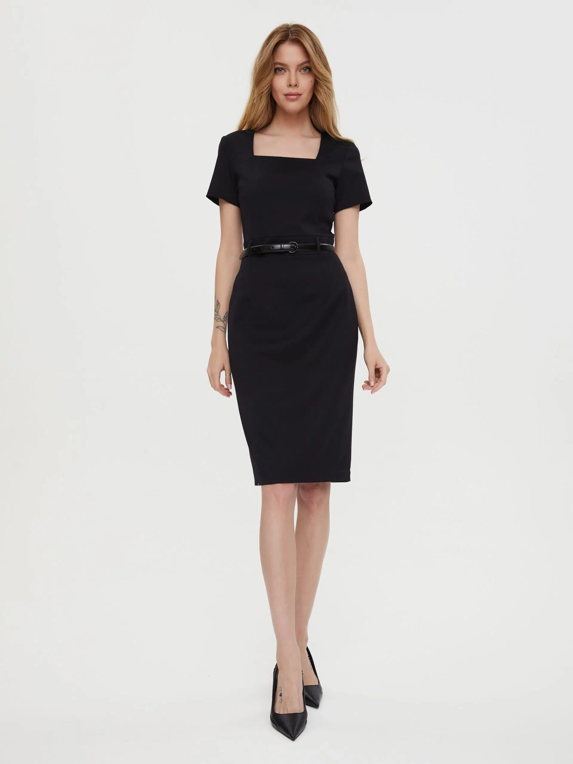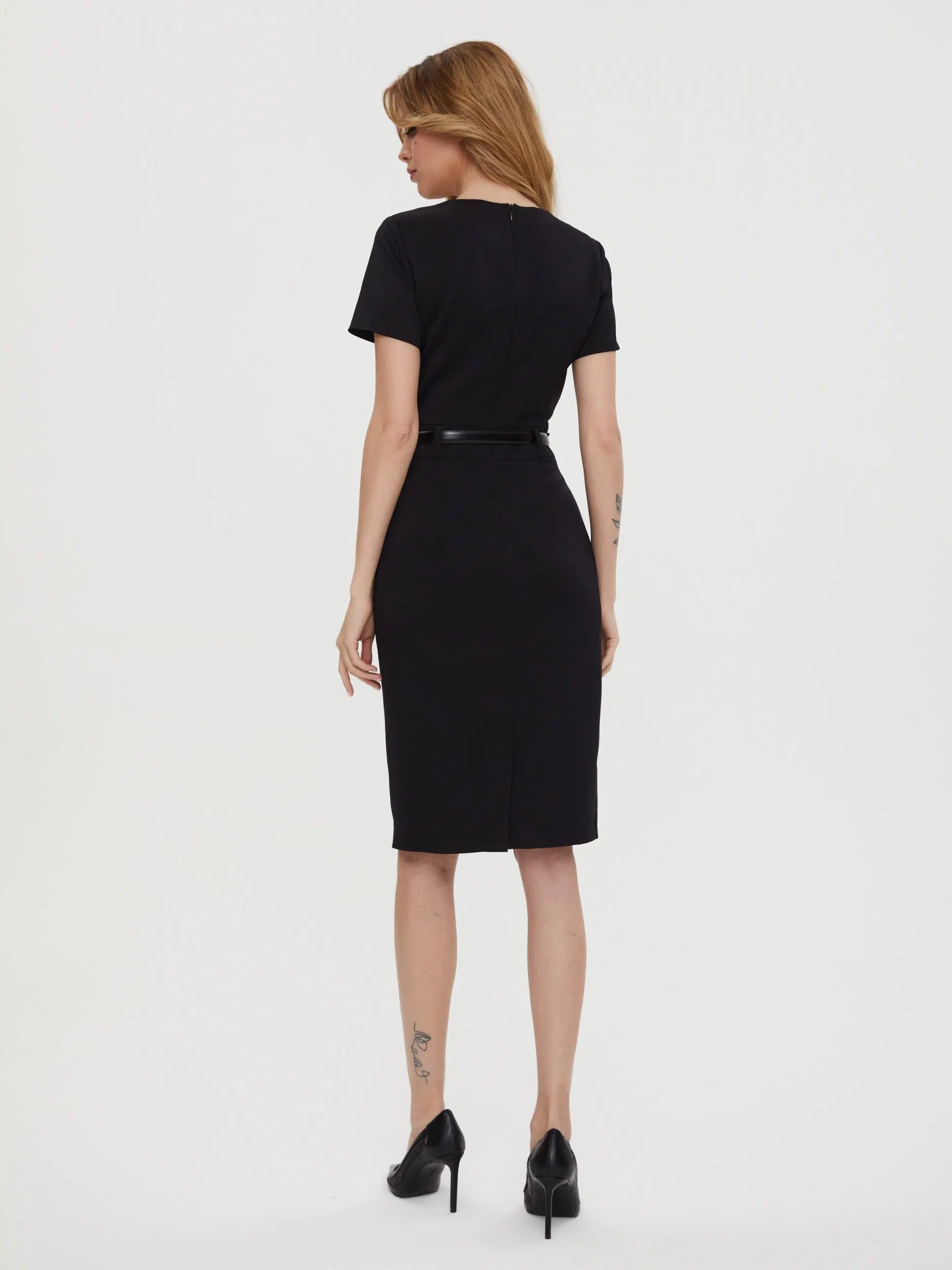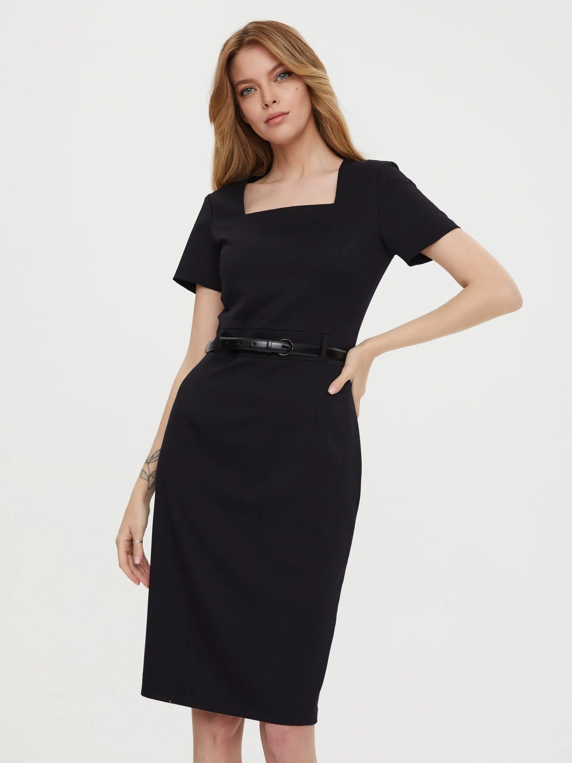 Элегантное платье из полушерстяной ткани. Отрезное по талии, силуэт юбки прямой.- застегивается на молнию, сзади со шлицей;- рукава короткие;- отрезной пояс и шлевки для ремня;- на подкладке.