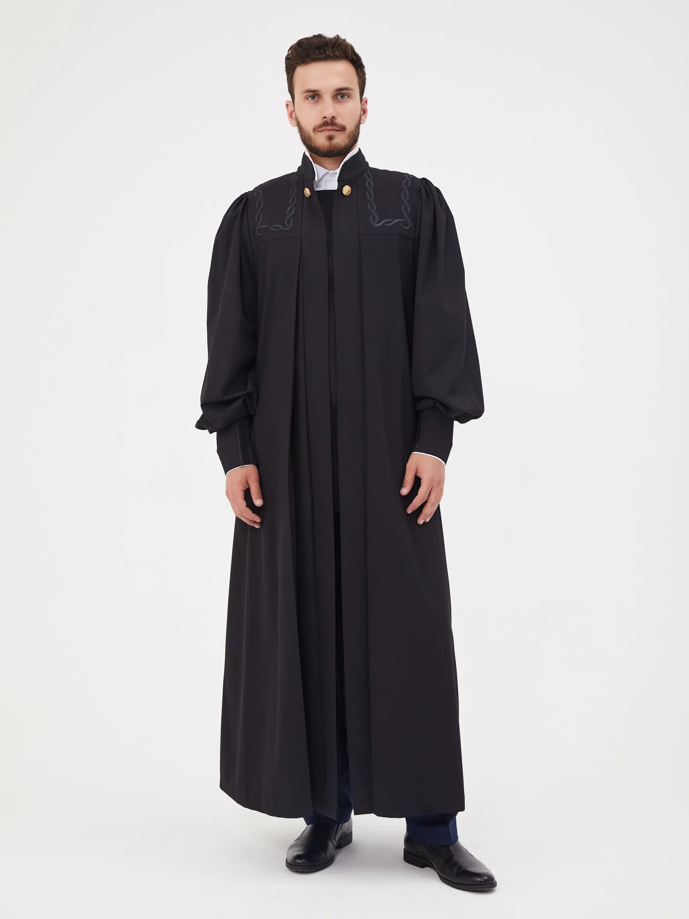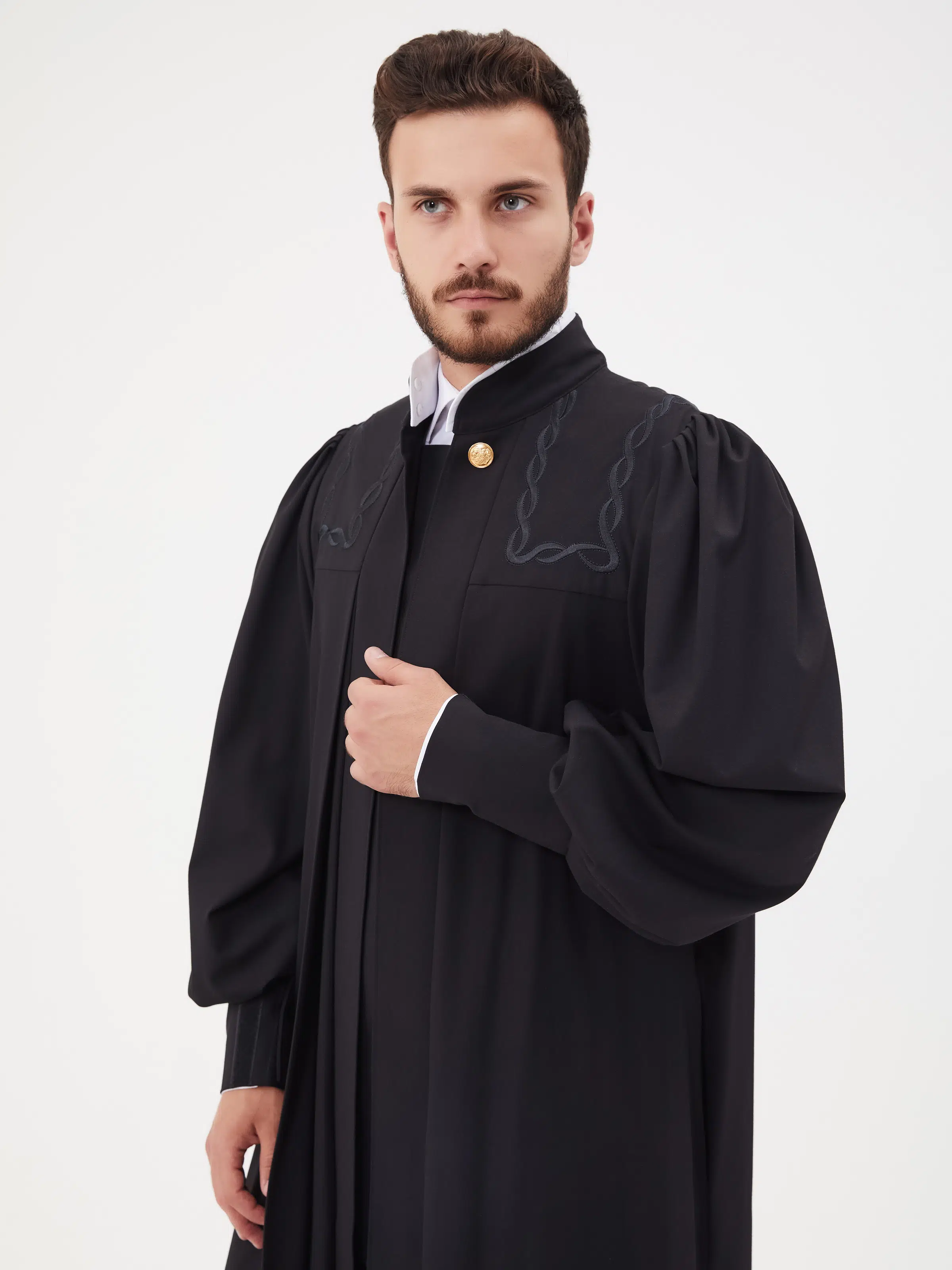 Судебная мантия мужская.Без подкладки, из высококачественной не мнущейся тонкой  ткани черного цвета. Силуэт трапеция с большой прибавкой на объем. Длина доходит до каблука туфель, расстояние от пола три-четыре см. Центральная бортовая застежка в стык на застежку «Молния» на притачном пластроне с внутренней стороны. Полочки и спинка на двойной отрезной кокетке цельновыкроенной, без плечевых швов, со сплошной вышивкой, переходящей на спинку (20 завитков, 8-ми конечный узор, 20 завитков) , притачной двойной планке от горловины, с глубокой односторонней складкой от угла кокетки в сторону полузаноса. По сгибу складки  проложена отделочная строчка, шириной шва 0,1-0,2 см. Карманы в боковом шве.